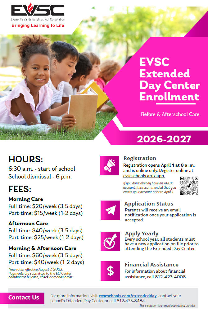 The Extended Day Center provides summer childcare services to EVSC students K-6th grade. Our theme based summer camp focuses on providing experiences through education and academic resource activities, character and leadership building opportunities, physical fitness, and student learning activities. We do all of this while having fun! The cost includes a t-shirt, field trips, breakfast, lunch, crafts, and an end of summer celebration.